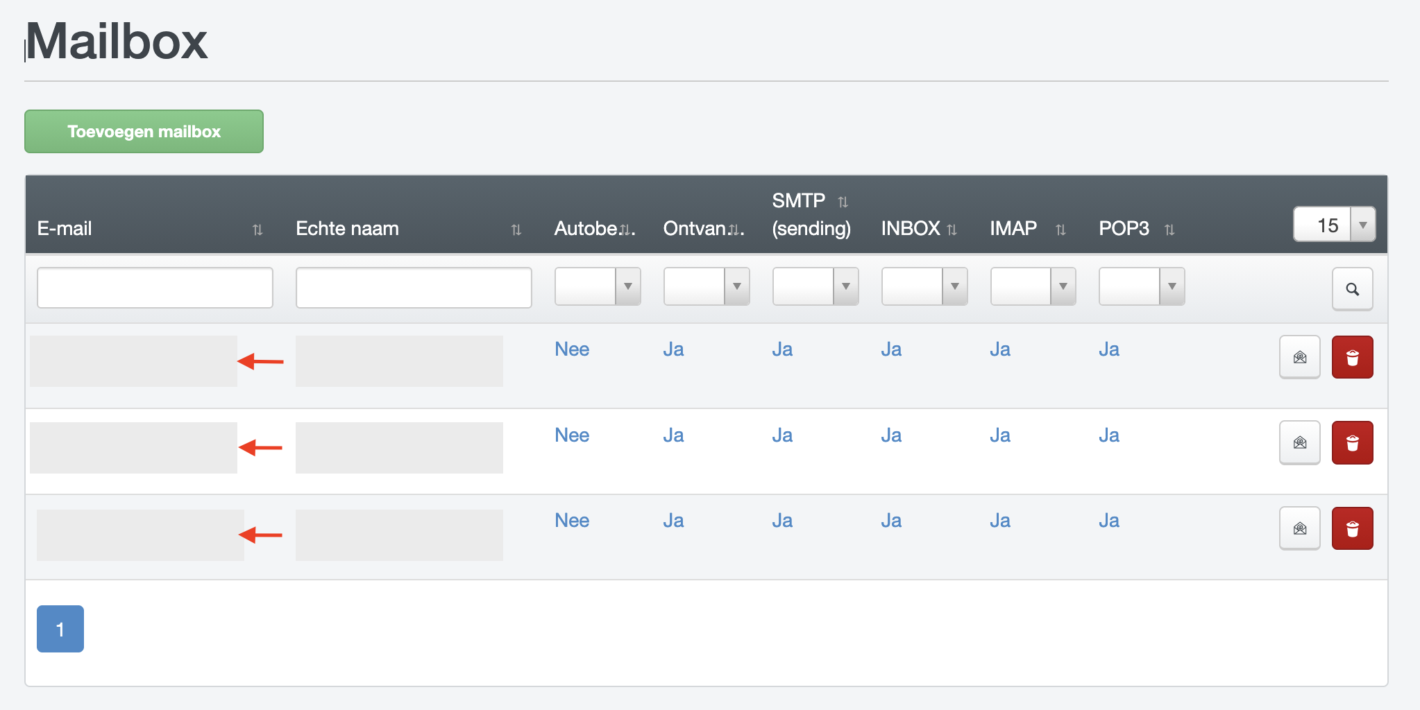 Als je op het E-mailadres klikt (zie rode pijl) dan zie je alle gegevens van deze mailbox.