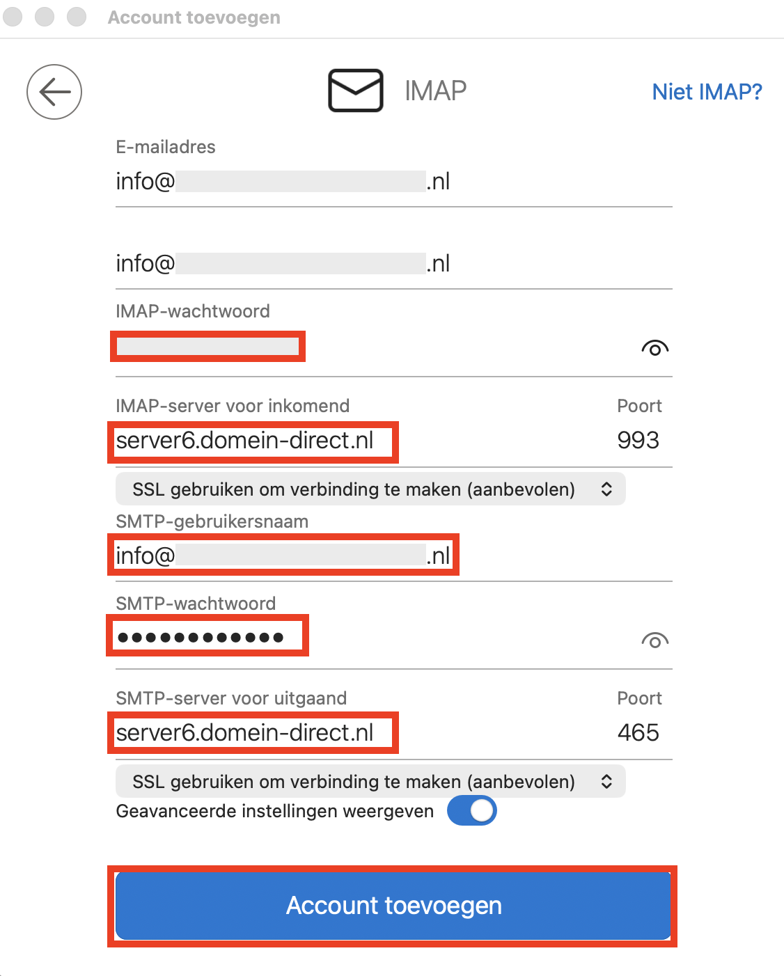 - de servergegevens voor inkomende (IMAP) en uitgaande (SMTP) mail